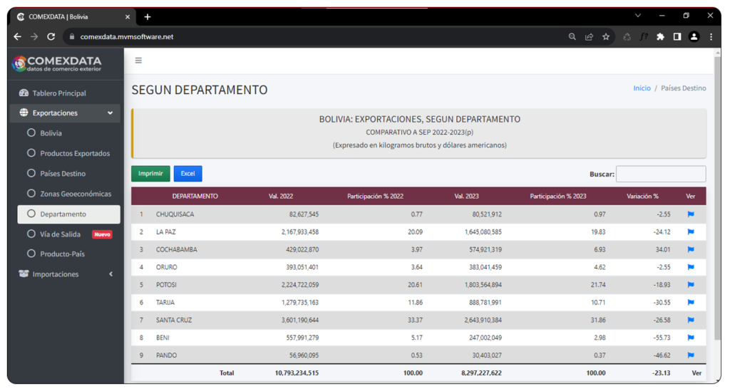 - Listado y Reporte de Exportaciones de Productos por Departamento.